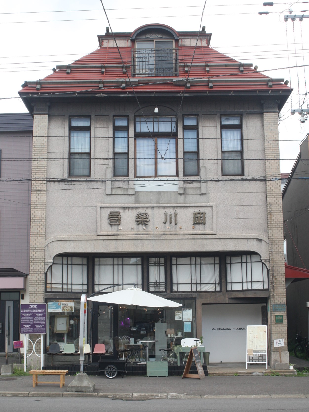 旧岡川薬局は1930(昭和5)年建築で、木造のモルタル塗り2階建て。基礎工事に1年をかけた重厚な造りで、赤いトタンの屋根は二重勾配の「マンサード屋根」や、屋根の途中から突き出た「ドーマ窓」があり、威風堂々とした和洋折衷のデザインが特徴だ。小樽市によると、昭和初期の代表的な商店建築とされている。