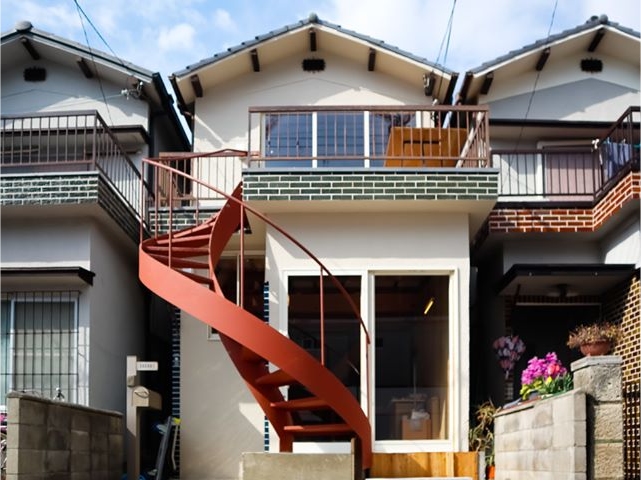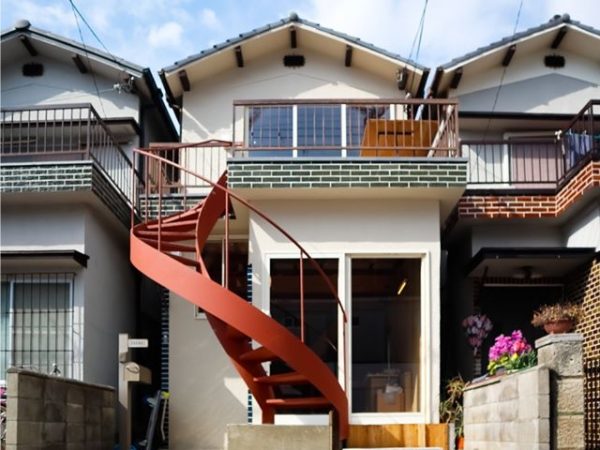 学生の部屋は奥の3~4畳の2室。なるべく共有スペースで生活してほしいという思いから、居室を狭くしている。特徴的な螺旋状の外階段は目印になるだけでなく、1階でイベントが開催されるときは、邪魔をせずに2階へ上がれる。