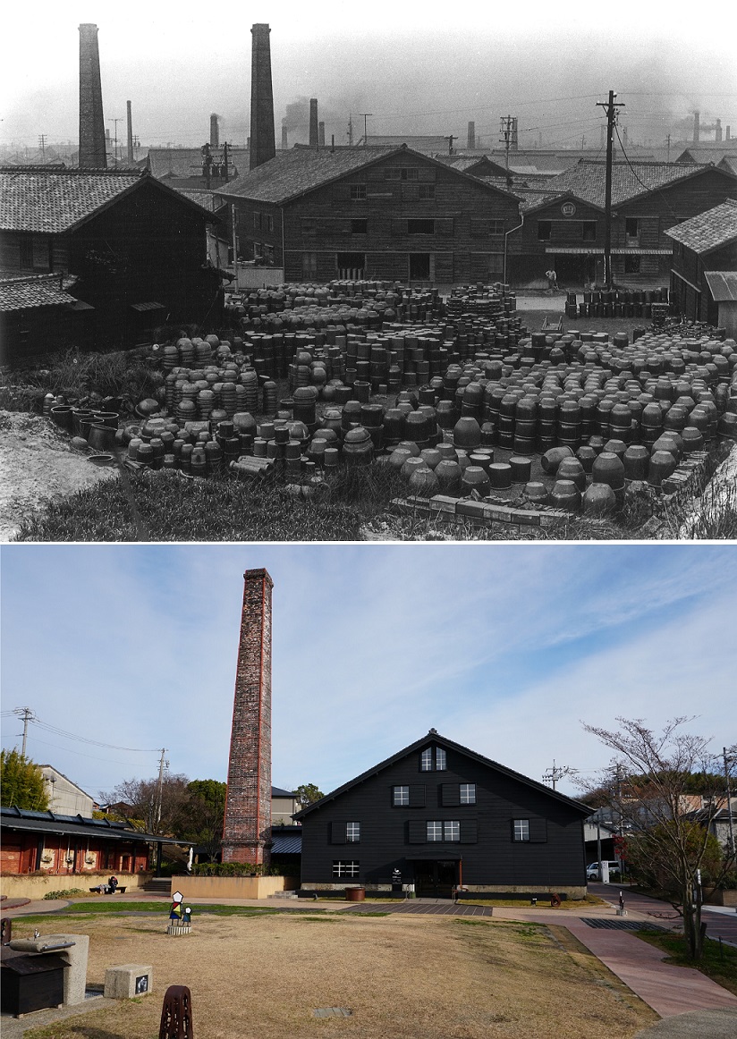 上/1963~1964(昭和38~39)年頃の常滑のまち(撮影:山田脩二、写真提供:INAXライブミュージアム)。下/INAXライブミュージアム「窯のある広場・資料館」。煙突の右隣の黒い建屋のなかに窯が設置されている平安時代末期頃からやきものの産地である愛知県常滑市。福井県の越前焼、愛知県の瀬戸焼、滋賀県の信楽焼、兵庫県の丹波焼、岡山県の備前焼とともに、“日本六古窯”の一つにも数えられている。