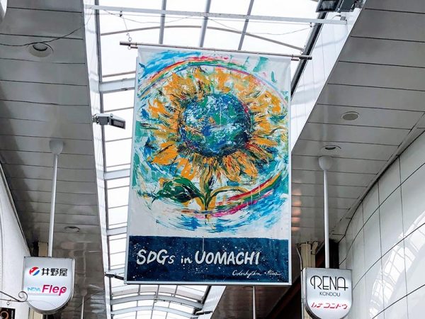 さらに宣言後は、SDGsを前面に掲げたイベントを次々と仕掛けている。2019年6月には、アートパフォーマーのカラリズム・リサさんを招いて「魚町銀天街SDGsアートフェスタ」を開催。その場でリサさんが制作したSDGsバナーを商店街に掲示している。子どもたちがSDGsをテーマに描いた絵も、商店街各所に展示した。