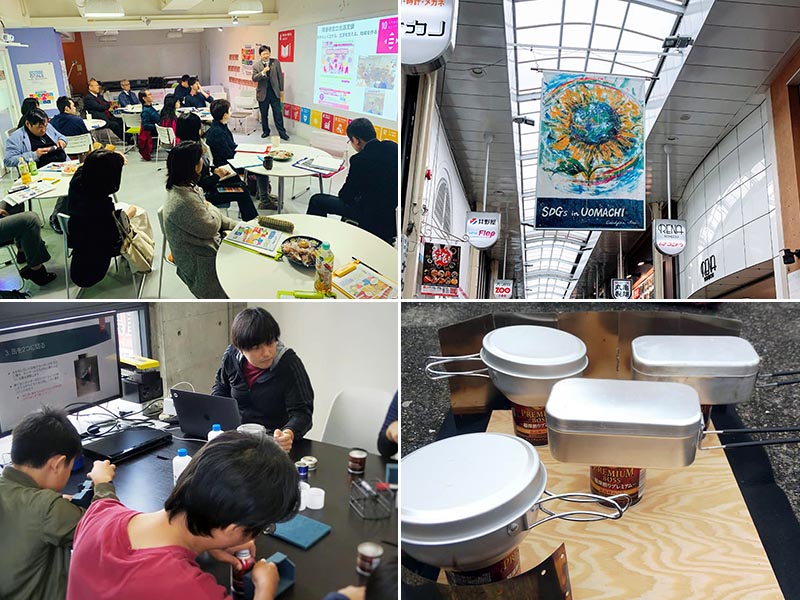 SDGs商店街を宣言する前から、魚町ではあらゆる人に開かれた教育活動を行っている。商店主が自らの専門知識や技術を伝授する、少人数制の無料ミニ講座「まちゼミ」だ。2003年に愛知県岡崎市で始まった試みで、魚町版の愛称は「うおゼミ」。毎年6月と11月に開催している。直近の2019年11月度は、50の講座が開かれた。そのテーマには、家の廃油で石けんをつくる、空き缶アルコールストーブでご飯を炊く、新聞紙やペットボトルを手芸・工作でリユースするなど、SDGsにつながるものも多い。