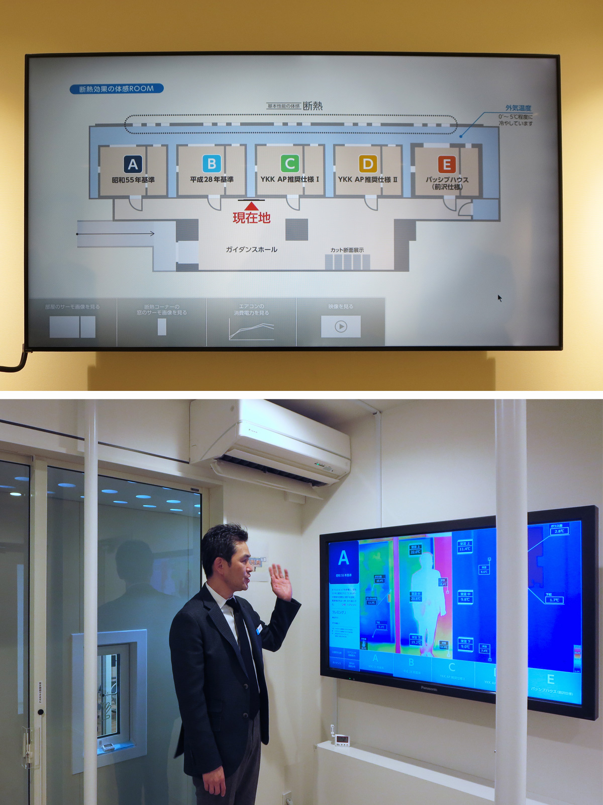 なかでも圧巻は、窓が室内環境へどのような影響を与えるのかを体感できる、AからEまでの5つの部屋である。それぞれ断熱性能が異なる窓が取り付けられていて、部屋の外は0~5度程度に設定されている。5つの部屋はそれぞれ22度設定の暖房室と非暖室に分かれていて、冬の寒い日に家の中で暖房をつけた部屋と、そうでない部屋を想定した空間になっている。