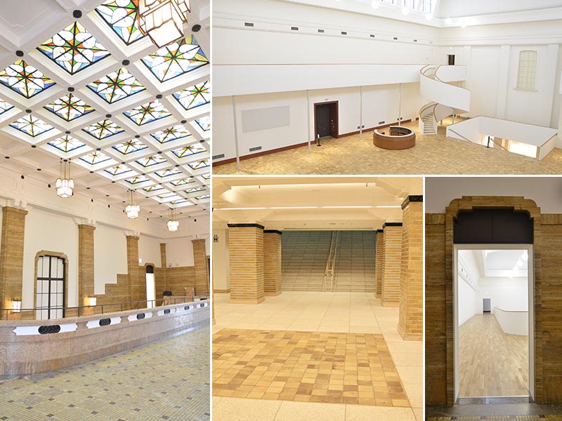 左)2階西広間。今回の改修では階段に手すりを付け、照明の電球をLEDに変えた。ステンドグラスや大理石は開館当時のまま。長い歴史を感じられる空間だ 上)天井高16mの旧大陳列室は、地下1階のメインエントランスのロビーから大階段でつながる「中央ホール」へと機能が変化。奥に見えるらせん階段は今回の改修で作られたもの 下中)こちらは、地下エントランスを直進し、大階段(奥)に進む空間。中央の敷石部分は、かつて下足室として使われていた場所。こちらの敷石も開館当時のものがそのまま使われている。傷みもあるが、それも“痕跡”として残されている 下右)2階西広間と、今回新設された北回廊をつなぐ出入り口。もともと窓だった部分を利用して作られたが、まるで、以前からあったように馴染んでいる公開日: