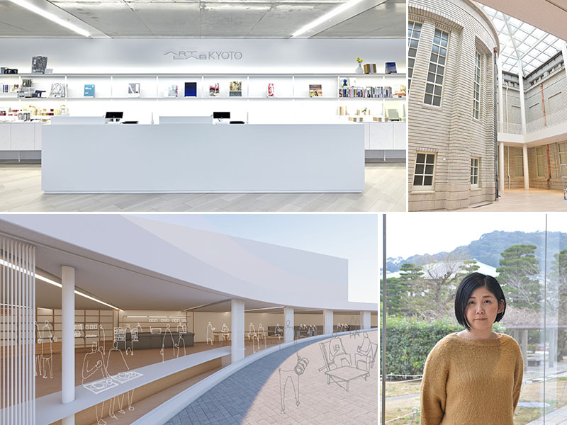 左上)「ガラス・リボン」の北側に新設されるミュージアムショップ「ART LAB KYOTO」。展覧会グッズ、美術書籍、オリジナルグッズなどがそろう 左下)ミュージアムカフェ「ENFUSE」は「ガラス・リボン」の南側に。京都の地場の食材を使用したメニューやコーヒーなどを提供。岡崎公園で楽しめるピクニックセットも 右上)以前は室外機などの置き場となっていた「光の広間」。今回の修繕で天井や柱が付けられた。「混雑時にはこちらに並んでいただいたり、トークイベントの会場として使ったり。多目的に使用できるスペースです」と西谷さん 右下)京都市京セラ美術館の広報担当・西谷枝里子さん。「京都市美術館から京都市京セラ美術館へ。どんなふうに変わったのか、ぜひ見に来てください」。新館「東山キューブ」での開館記念展「杉本博司 瑠璃の浄土」は6月14日(日)まで公園を散歩しているかのような気分で美術館を通り抜ける