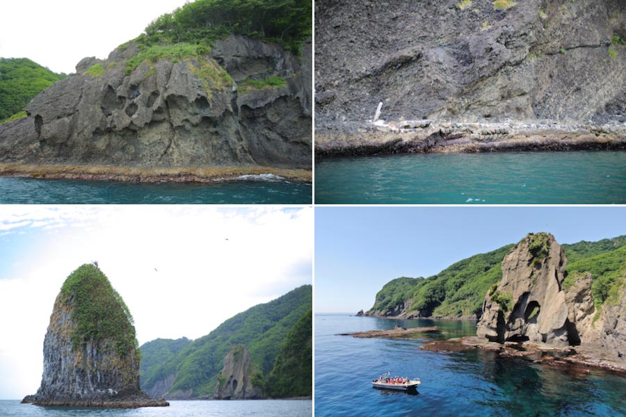 まず船に降りると、ガラスの船底をのぞかなくても、透き通った海の底まで見ることができる。船長の福士さんの操縦で静かに船が港の外へと出て行くと、5分もしないうちにオバケ岩という、まるで巨大な髑髏のような岩が見えてくる。さらに進むと耳岩という、その名の通り浸食された穴が耳の形をしている巨岩が現れる。この見たことのない複雑なカタチの岩の根元に、まるで天然のテラスのように広がるのがタタミ岩だ。