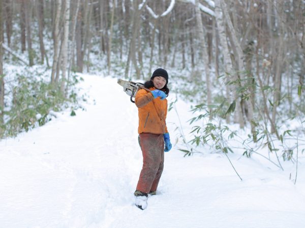 「自分は、北海道の森という大きなくくりの中で働く木こり、という意識を持っています。そして地元である札幌にも『木こり』として戻ったら面白いだろうな、という考えが心の中にあって、滝上から12号線を袈裟懸けに旭川から札幌まで股にかけて、木こりの仕事ができるようになったらいいなぁなんて妄想しながら、陣内さんの仕事を手伝い、そして助けられながら技術を身につけていきました」