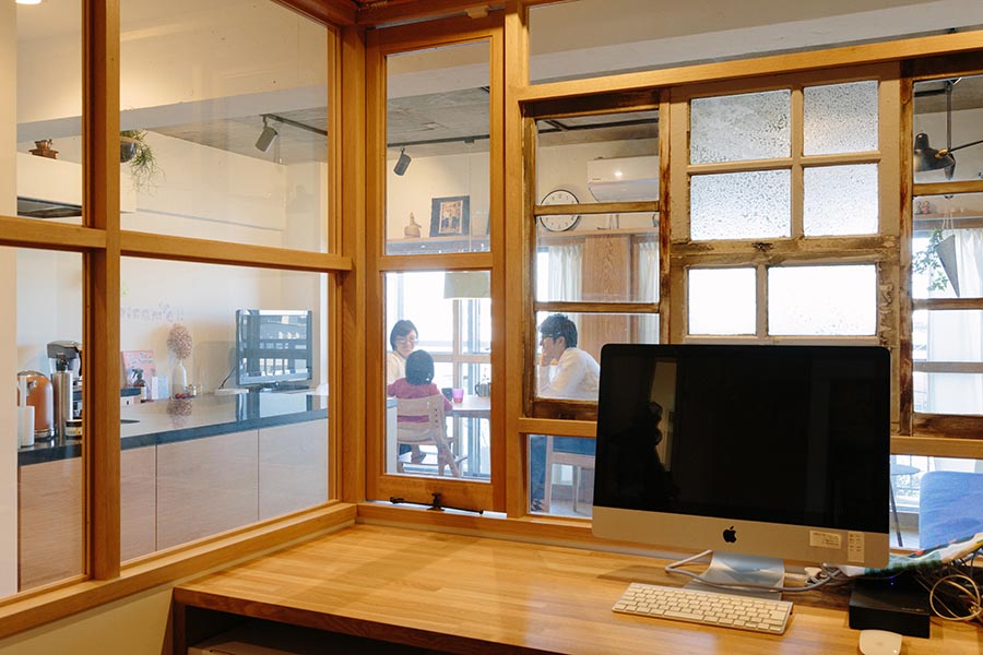 [事例7]では、キッチンから続くダイニングスペースを壁で間仕切り、ワークスペースとして独立させている。ただし、壁にはガラス窓を設けて、仕事中でも隣のリビング側にいる家族の様子が目に入るようにした。