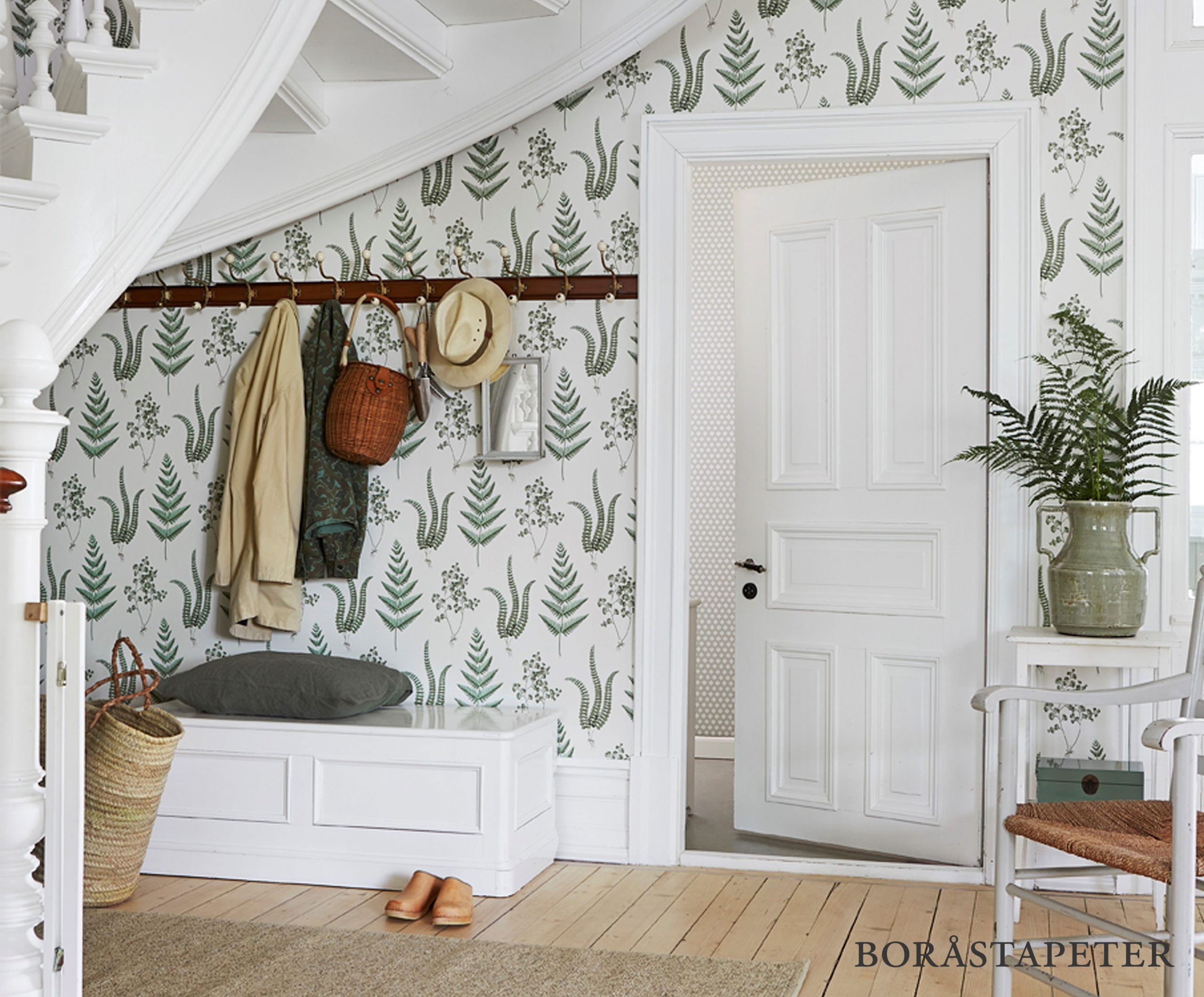 海外では、玄関から階段室までの大胆な壁紙の貼り方がはやってきている。家を楽しい空間にしようと、手頃な価格でイメージが変えられるデザイン壁紙が多く出ている。玄関は比較的光が入りにくいことが多い。そんなときでも明るい色の壁紙をアクセントとして背景に貼れば、置かれる雑多なものもオブジェのように映え、素敵なディスプレイとして楽しめる。