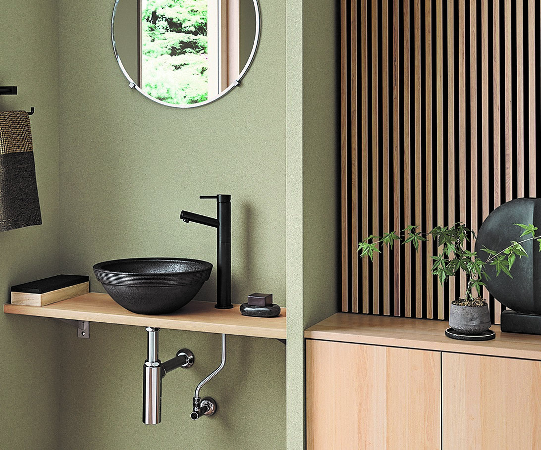 玄関は階段室の近くであることも多く、家でも何度となく通過する。そこにデザイン性の高い壁紙を貼ればわずかなスペースが素敵な装飾空間となり、暮らしを豊かに彩ってくれることだろう。天然素材や輸入の壁紙など、少し価格の高いものも、限られた面積ならコストも抑えやすい。最近は温かみのあるグレーなどのニュアンスが加わったモノトーンも人気で、なじみがよく置くものによる変化の演出が楽しめる。