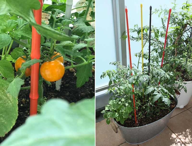 ミニトマトは日当たりの良い場所が大好きなので、ベランダガーデニングにぴったり。軒が深いベランダの場合、夏は日が高くなってしまうので、手すり側に寄せてプランターを置くとぐんぐん成長します。茎は7月頃になると1m以上に成⻑しますから途中さらに丈の高い支柱が必要になりますが、支柱をカラフルなもので揃えるようにすると、ベランダの風景が鮮やかになります。