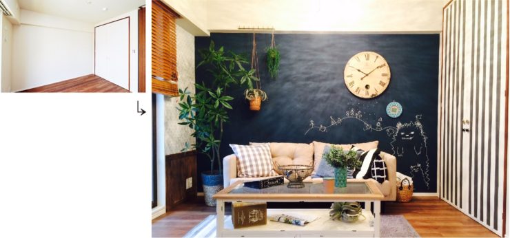 誰にでも簡単にできて見た目が大きく変わる手といえば、インテリア用のマスキングテープ。文房具店で売られている文具としてのモノと違い、50mm、100mmなどと幅があって面の印象を変えやすいことに加え、貼っても跡を残すことなく剥がせるので賃貸でも気軽に使えるのが何よりのメリット。最近はインテリア性の高いさまざまな柄が登場しているので、選ぶのも楽しい。