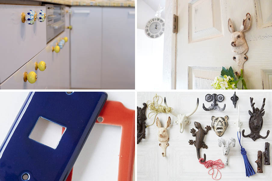 家具の取っ手も簡単に交換できるが、一般的に販売されている取っ手は1本のネジで付けるタイプが多く、手持ちの家具に合うかどうかが問題。スイッチプレートも各種販売されており、プラスチックからスチールやアンティーク風のタイルなどに替えるだけで雰囲気が変わるが、年代によってサイズが違うので事前に交換できるかどうかの確認を忘れないこと。