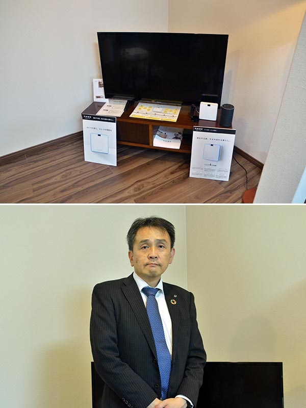 上/テレビの前に置かれている白い機器がベックス。「テレビをつけて」「お風呂を掃除して」といった音声を認識し、家電をコントロールする 下/平安建材の水嶋弘明さん。「生まれ育った家で生涯暮らしたい、京都の風情を残したいという方や、京都に憧れを持つ他府県や外国の方、皆さんの“京都ぐらし”を応援したいと思っています」「Alexa(アレクサ)、ベックス(※)でテレビをつけて」