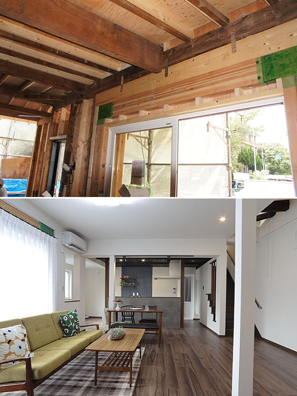 「震度6強の地震が起きた場合の耐震シミュレーションの結果、リノベーション前は上部構造評定(家の構造物の耐力)は0.14でした。これは“倒壊の可能性が高い”という数値。それがリノベーション後は、“倒壊しない”という評価である1.5にアップしました。耐震等級でいいますと最高レベルの『3』に相当します。大手ハウスメーカーが手がける新築クラスです」