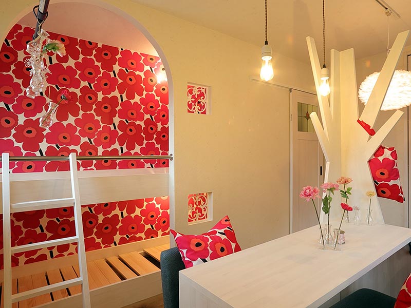 この子ども部屋は、京都の雑貨店「INOBUN」のデザイナーが内装、家具、雑貨をコーディネートしている。フィンランド発のアパレル企業「マリメッコ」のテキスタイルやおしゃれな照明が印象的だ。長い年月を刻んできた家をどのように現代的な空間に変身させるかも、古い住まいの再生には大きなポイントになるのだろう。