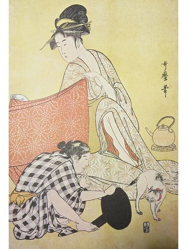 そこで大切な猫が逃げ出さないように、奉公人に命じて見張らせた豪商たちもいたようである。実際、多くの絵画作品の中に、女主人の横に猫を抱えて世話をする女中の姿が描かれていて、まさに猫女中の存在をうかがわせる。