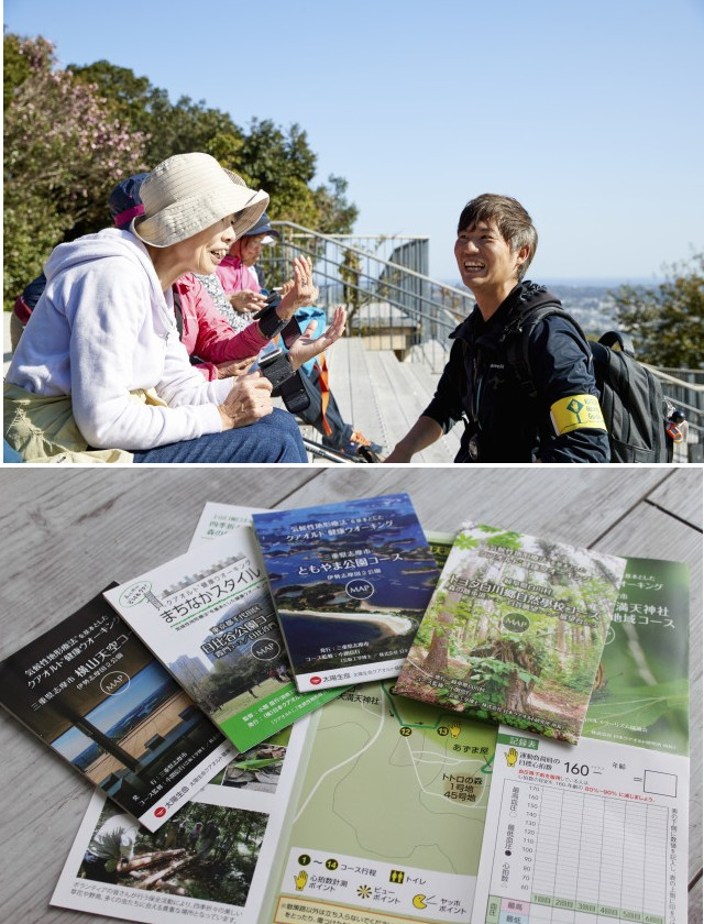 上/専門ガイドと一緒にウオーキング。途中で体表面温度や心拍数を測り、参加者の体力に応じてスピードを調整。下/コースごとに用意されたポケットサイズのマップ。記録表に心拍数や血圧、体表面温度を記して自分の体調と向き合う