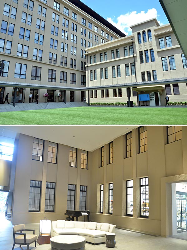 上/右が既存棟、左が新築棟。新築棟の窓の配置が既存棟のデザインを踏襲されているのがよくわかる。これも伝統と革新の融合である。下/かつては外壁だったコの字型の既存棟の壁。今は天井が付けられ、既存棟と新築棟(写真左側)とつなぐスペースになっている取材をしながら感じたことは、既存棟と新築棟が違和感なく調和していることだ。これらの建物の間には1世紀近い年月があるにもかかわらず、である。