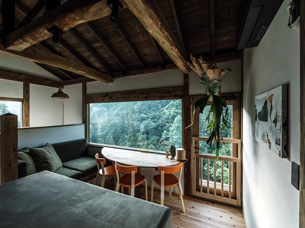 その1年後の2020年8月にオープンしたのが小菅村の特徴的な地形である急峻な崖に張り出すように立つ2棟を改修した一棟貸しの客室「崖の家」である。村の総面積の95%が森林(そして、その約3分の1は東京都の水源涵養林!)である小菅村には人が使える土地が少ない。そこで村では平らな土地は農業に使い、人は崖地に家を建ててきたという。