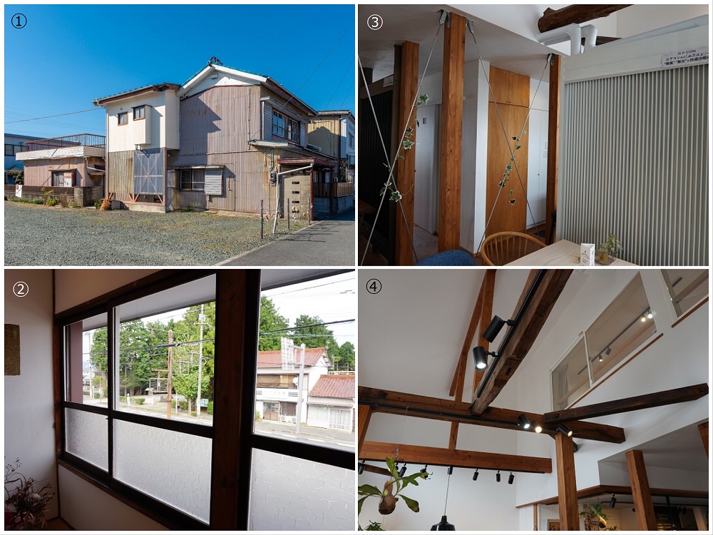 ①リノベーション前の建物。真ん中部分は減築して、半外の廊下でつなぎ、左側の建物を離れにした(写真提供:イトコー)②あえて断熱性などに手をつけていない2階。実際、1階との外の騒音の響きの違いに驚いた。窓や階段の手すりなどは昔のものを残し、内装的には雰囲気づくりにも役立っている。左側の壁に見えるのは、土壁を額縁のように一部だけ残したところ