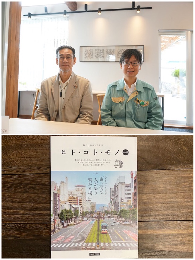 上/取材にご対応くださった、イトコーの3代目社長・伊藤博昭さん(右)と戸建部門 営業統括マネージャーの松原登志雄さん。下/イトコーが発行するフリーペーパー「ヒト・コト・モノ」。豊川市のある東三河エリアの人や施設などを紹介する。「これもイトコーという会社が、地域社会にオープンマインドで開いているよというきっかけのひとつでもあるんです」と伊藤さん。イトコーでは地域とのつながりも大切にし、本社敷地内でのマーケットを年1回開催したり、講座や企画展などのイベントも行っている