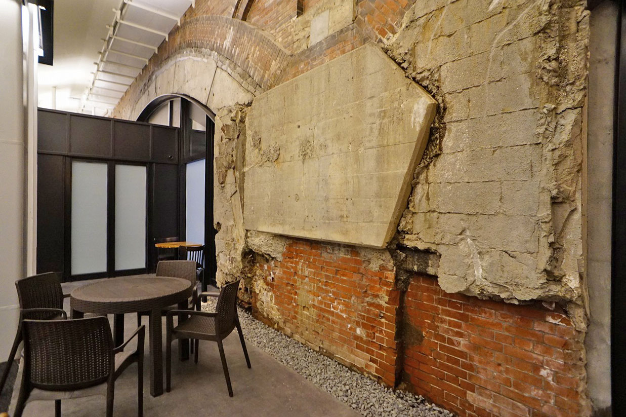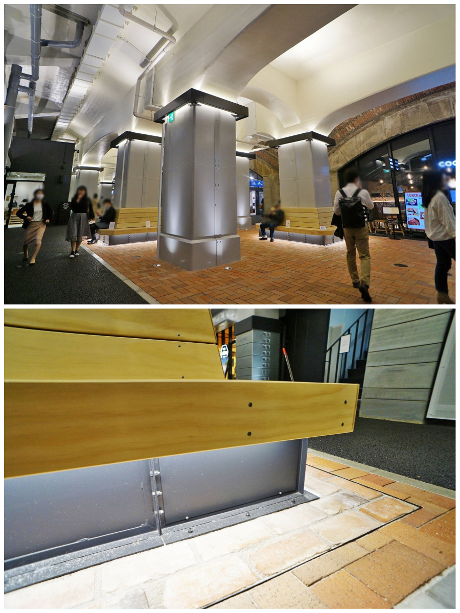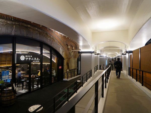 ▲煉瓦アーチの内側のコンクリートはこれまでも定期的に実施されてきた耐震補強の跡。構造部がむき出しになっているのが面白い。「路地としての役割を果たすため、タテだけでなくヨコの出入口もなるべく多く設けて通り抜けしやすい動線を心がけました。現在は工事の関係で23時に閉鎖していますが、今後は24時間通行できる予定です」「有楽町~新橋の高架下は、飲食店や事務所、倉庫など様々な用途で利用されてきており、長年この場所でご商売を続けている方がいらっしゃいました。そのため、高架下の再生を行うためには事前の調整が必要だったのです。