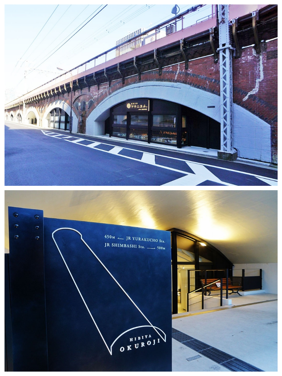 日比谷OKUROJIの天井を見上げてみると、煉瓦造りの部分と白いコンクリート部分に分かれているのですが、煉瓦のほうは明治43(1910)年の高架線工事のときのもので、現在はJR山手線や京浜東北線の線路が走っています。白いほうは昭和17(1942)年に造られたもので東海道本線の線路。さらにその奥には、昭和39(1964)年に開業した東海道新幹線の線路があり、時代に合わせてどんどん高架橋の幅が拡幅されて現在のような形になりました。