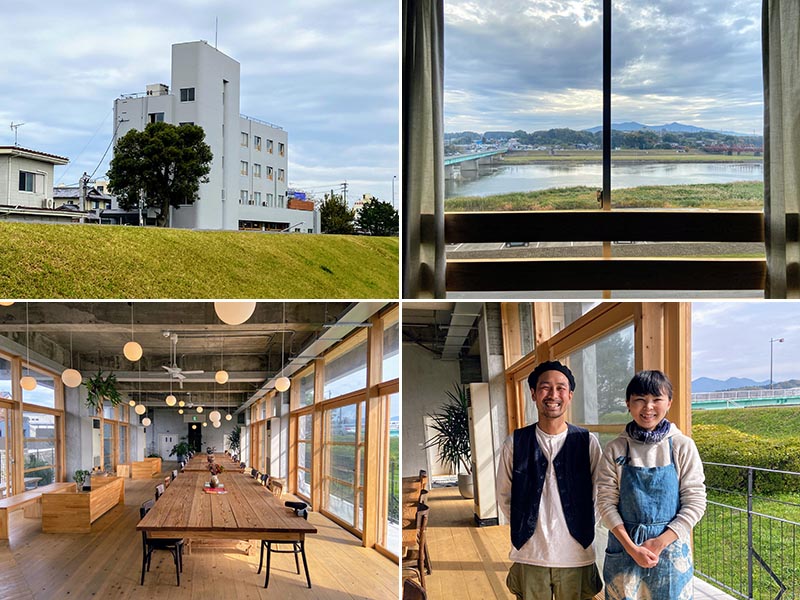 上左/HIKEの西側を流れる高瀬裏川。手前の「高瀬眼鏡橋」と奥の「秋丸眼鏡橋」はいずれも江戸時代の石橋だ。水辺は公園になっており、5月から6月には約66000本の花菖蒲が咲く 上右/HIKEのある高瀬の街並み。江戸時代に建てられた築200年、300年の古民家が今も残り、老舗の酒屋やお酢、味噌、醤油の醸造元や茶舗、菓子店などが軒を連ねる 下左/菊池川には江戸時代の船着き場の痕跡が残る。写真手前の石積みがそれだ。川に架かる鉄橋は、煉瓦の橋脚が明治、その上のトラス式橋梁が大正のもの。複線化に伴って昭和に手前の橋が架けられた。4つの時代の土木構造物が集まり、ここが交通の要衝であり続けた歴史を感じさせる 下右/HIKEの秋のランチセットの一例。炊き込みご飯は玉名郡和水町の無農薬米に熊本県天草産の芽ひじき。デザートには玉名郡玉東町の果樹園から季節の果物を仕入れている。ほかにも、熊本の郷土料理「だご汁」や玉名郡南関町特産の「南関揚げ」を使ったいなり寿司が名物だ。「旅人に、ここでしか味わえない家庭料理を楽しんでもらいたい」と佐藤さん夫妻屋上から広がる景色に一目惚れ。根気強く事業計画を練る