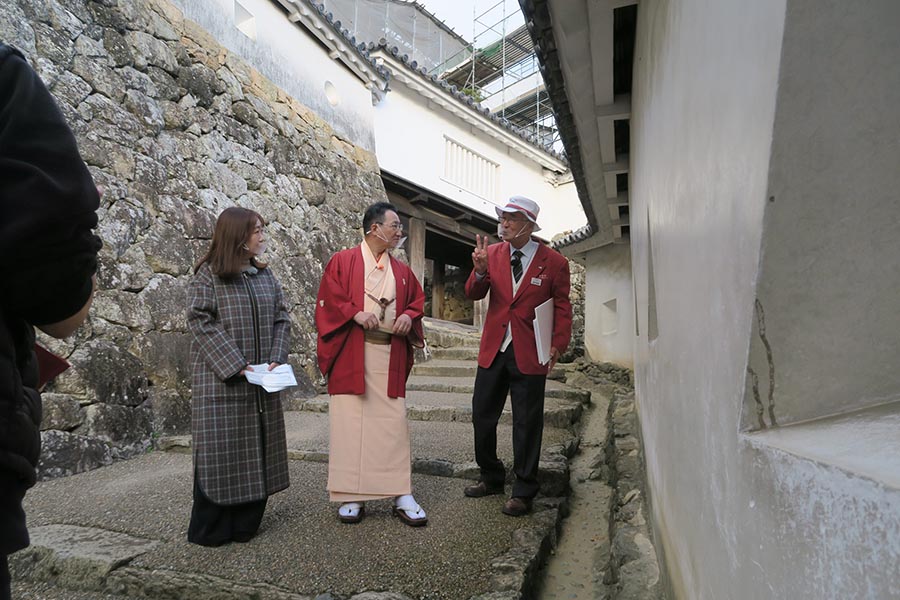 天守へ至る門が「い・ろ・は・に」と周回して続くのも特徴で、豊臣を睨んだ徳川最前線の城としての仕掛けがよく残っており、護りを固める工夫や装置がわかるのも魅力だ。コロナ禍の下、集客に苦労しているのは世界遺産といえども例外ではないが、公益社団法人姫路観光コンベンションビューローなどが主体となって、観光客誘致について、新たな試みを始めている。取組みの一つとして、11月28日に姫路城の縄張りを巡るバーチャルツアーが開催されたので参加した。