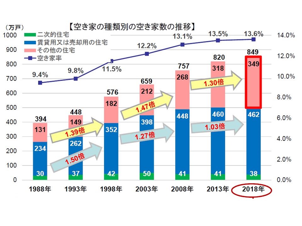 近年、住宅に関する問題として常に取り上げられるようになった空き家の増加。1998年時点では576万戸だったが、2018年には849万戸まで増えている。20年間で約1.5倍になってしまったのだ。しかもそのうちの「賃貸用または売却用の住宅」以外、つまり使い道が決まっていない住宅を含む「その他の住宅」の数は約1.9倍(182万戸→349万戸)に増加している。放置され老朽化した空き家は、倒壊の危険性があるだけでなく、不審者の侵入、放火、ゴミの投棄、悪臭、害虫の発生など周辺の住環境へさまざまな悪影響を及ぼす可能性があるので対策が必要だ。