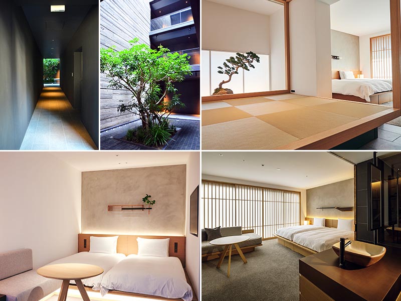 左上/ロビー・ラウンジと宿泊棟を結ぶ、ほの暗い通路。100年という時の流れをつなぐ場所となっている 上中央/宿泊棟にある吹き抜けの坪庭。左側の壁は1枚ずつ木目をかたどったコンクリ―ト製だ 右上/畳スペースがある「Tsuboniwa Suite」(写真提供:nol Kyoto sanjo) 左下/「Tsuboyu Superior」。ベッドの上のアートワークは、町家の桟や欄間を使用して作られたもの。各部屋でそれぞれ異なる作品が飾られている(写真提供:nol Kyoto sanjo)右下/「Hibaburo Deluxe」は、大きめの檜葉(ひば)風呂でゆっくりと疲れを癒やせる ※檜葉風呂は全客室に設置(写真提供:nol Kyoto sanjo)