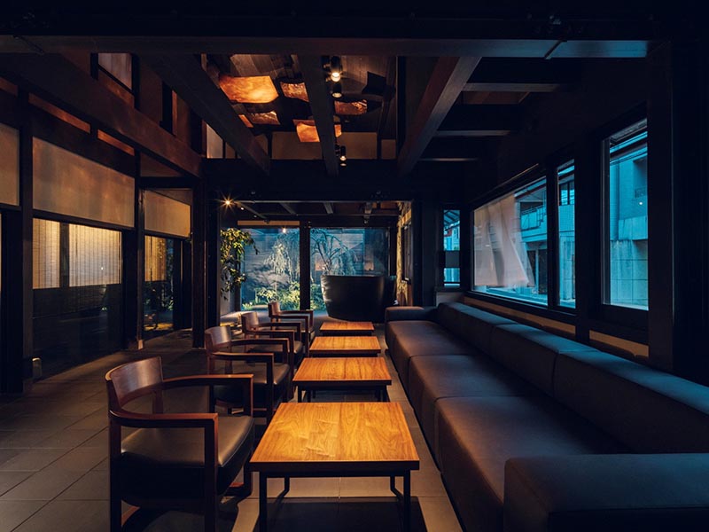 黒漆喰の壁に映える白いのれんをくぐって中へ入ると、そこがフロント機能も持つロビー・ラウンジ。かつてキンシ正宗の日本酒が販売されていた場所である。