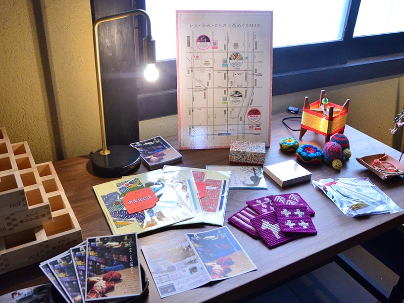 例えばロビー・ラウンジに置かれている、京都市内にある手芸店や組ひも工房などの手軽な体験キット。宿泊客が手作り体験をすることで、その店や京都の文化に関心を持ってもらいたい、そしてそこに足を運んでもらいたいという気持ちで用意されている。