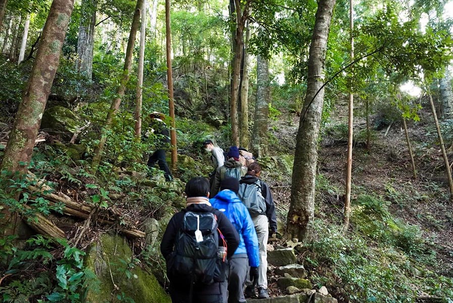 フィールドワーク最終日は、田辺市長 真砂充敏氏による案内のもと、熊野古道を歩いた。滝尻王子から高原までという中辺路のほんの一部ではあるものの、標高341メートルの飯盛山を通る登山道のほか、熊野古道・中辺路で最も古い建物である高原熊野神社や、熊野古道に面した民家や畑など、里山らしい光景も目にすることができる充実のコースだ。