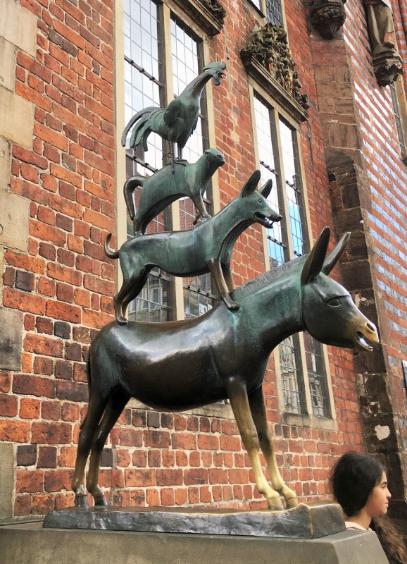 街道の終点となるブレーメンは、ロバ、犬、猫、鶏の「ブレーメンの音楽隊」で知られている町。中心部にある広場には絵本に出てくるように4匹が乗った銅像があり、記念写真のスポットとして人気である。お土産屋にはぬいぐるみやオブジェ、絵本など関連グッズが置かれている。市中心部にある15世紀初頭に建てられたブレーメンの市庁舎と、天蓋を支える支柱を入れると高さ10mにもなるローラント像がユネスコの世界遺産となっている。また狭い路地に建物が密に並んでいるシュノーア地区には、かわいらしいお土産屋やカフェが並び、多くの観光客が訪れている。
