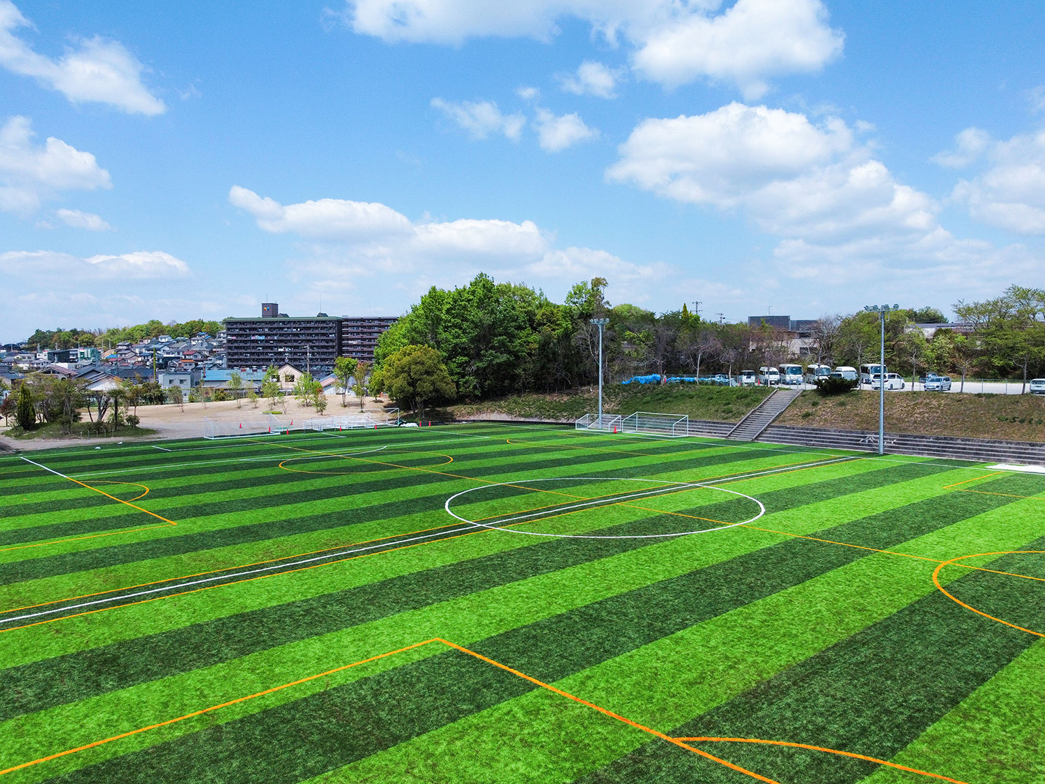 広々としたグラウンドは緑が鮮やかな全面人工芝で、照明やバックスタンドも設置されている。それだけでも珍しいが、実は、地元のフットボールクラブ・瀬戸FCのホームグラウンドも兼ねている。グラウンドを貸す代わりに整地を任せるスタイルを取っているというから興味深い。
