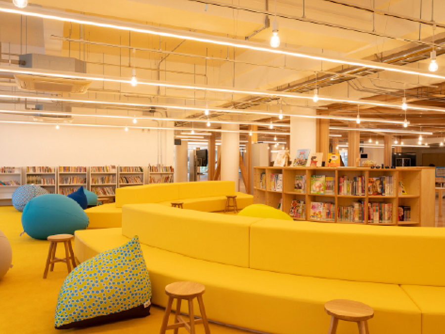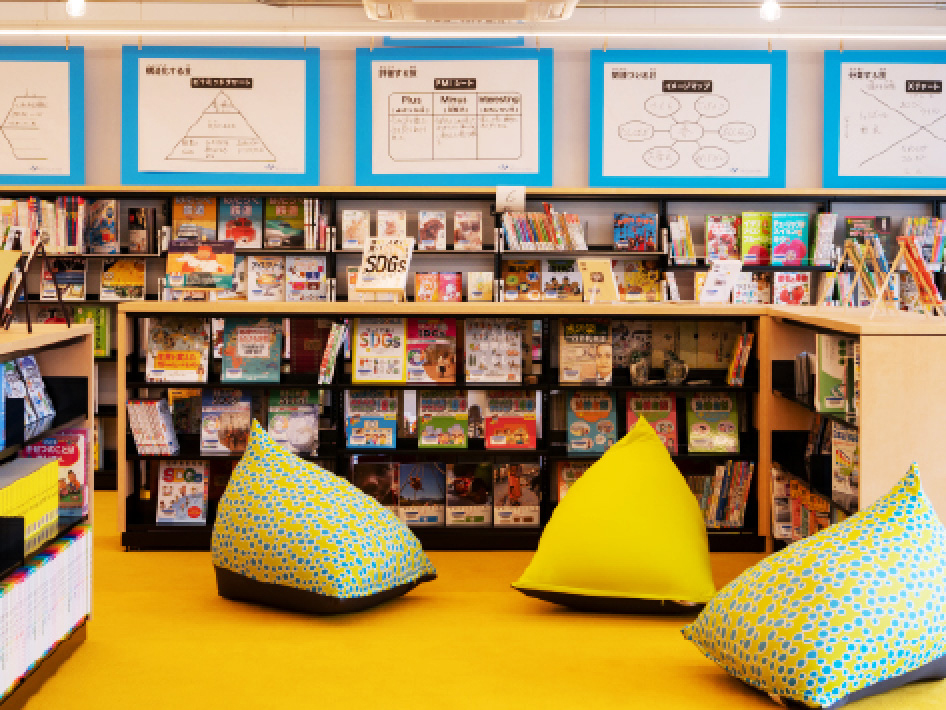 いわゆる図書館のここにも壁がない。7,000冊の所蔵図書を校内に分散配下しているのも特徴。英語・ICT・探究心を育てるための本も多く、貸出手続きなどは児童各自がタブレット端末で行う。電子書籍もあり管理や検索もスムーズ。