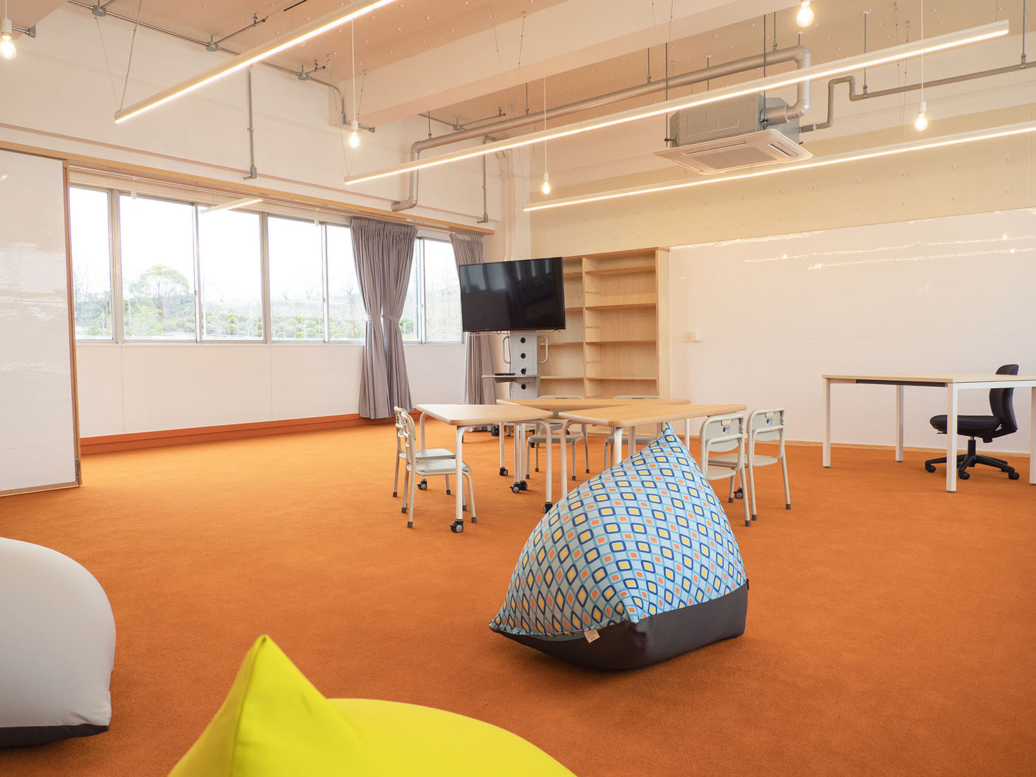 教室が連なるフロアは一面が鮮やかなオレンジ色のカーペット敷きで、従来の教室の姿とはかなり違う印象。