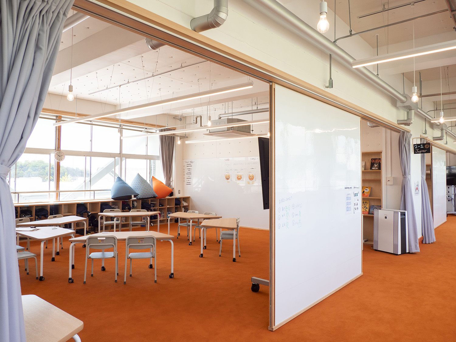 特筆すべきは、”教室と廊下の間に壁がない”ことで、吊下げ式の可動ホワイトボードと防音性の高いカーテンが備えられ、それで仕切ることはできるものの基本的には常に開かれていることに驚く。