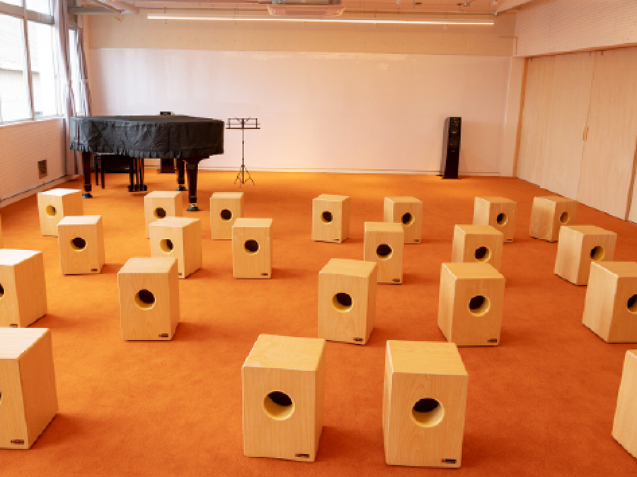 そして音楽室は、児童が座る椅子が打楽器の「カホン」なのが面白い。各教室と同じく、吸音ボードを採用して音に配慮。音の反射をなるべく無くすために、一般的な正長方形の空間ではなく、壁の角度を調整して面を増やして壁からの反響が少なくなるように設計したそうだ。