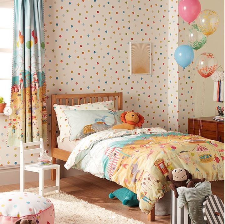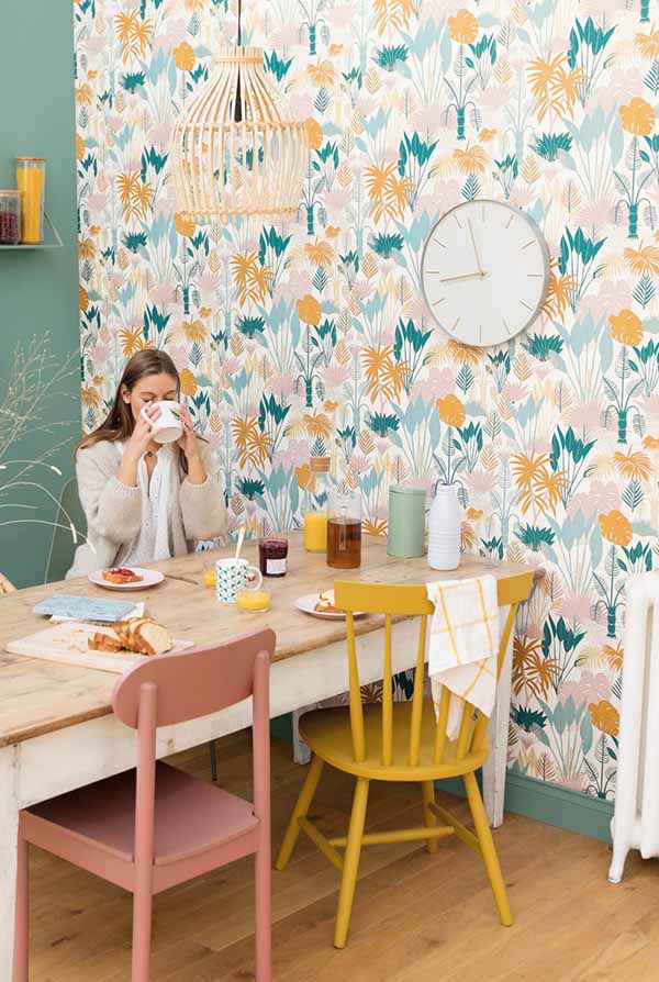 壁紙の色に家具やクッションの色を合わせると、空間につながりができて、友達を招きたくなるような空間に変身する。一見華やかな柄も隣接する壁に締まる色を合わせれば、柄が引き立ち完成されたイメージになる。