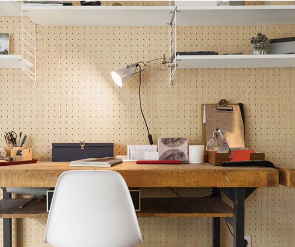 机の前の壁の壁紙を替え椅子や照明で個性を出すと、スペースはそのままでも気分が変わり、自分らしい思いを反映したホームオフィスを作ることができる。