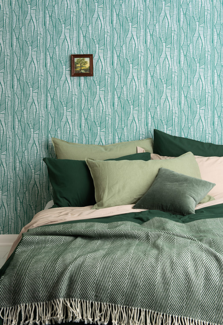 緑は安らぎの色、安心してリラックスする空間作りにおすすめである。白い壁やグレー、ベージュなどのベーシックな色との相性もよく、緑の濃淡のベッドリネンを合わせれば、安らぐ空間が作れるだろう。
