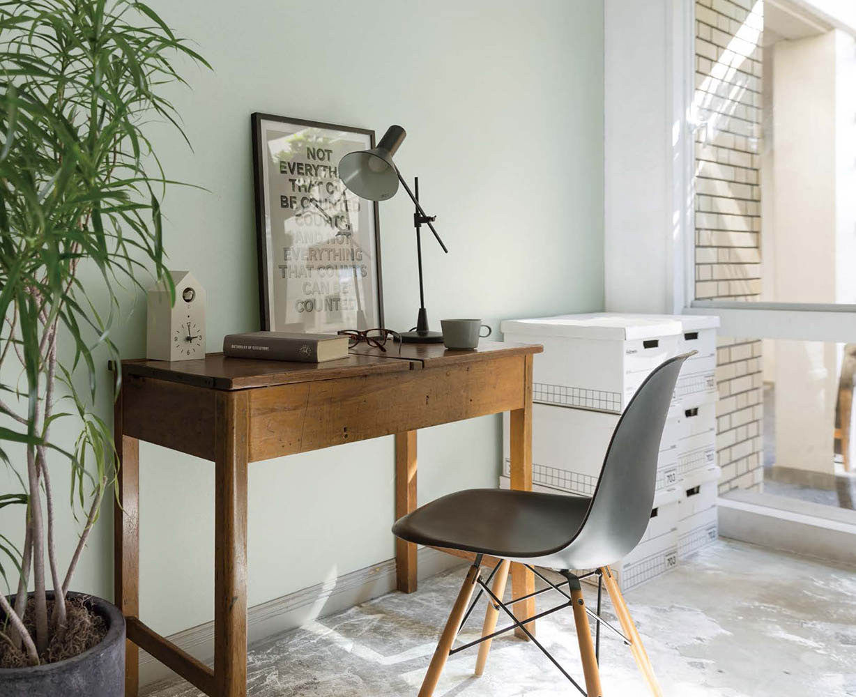 適度に集中して緊張を感じさせないブルーグリーンは、ホームオフィスに向く壁紙のひとつである。ホームオフィスは、家族が共有して使ったり、リビングに隣接している場合もあり、家庭の雰囲気に溶け込み事務的で冷たい印象を与えないものがよい。ストレスを軽減し目も疲れにくく、グリーンの安心感とブルーの集中力を併せ持つブルーグリーンは、ホームオフィスにおすすめの色である。