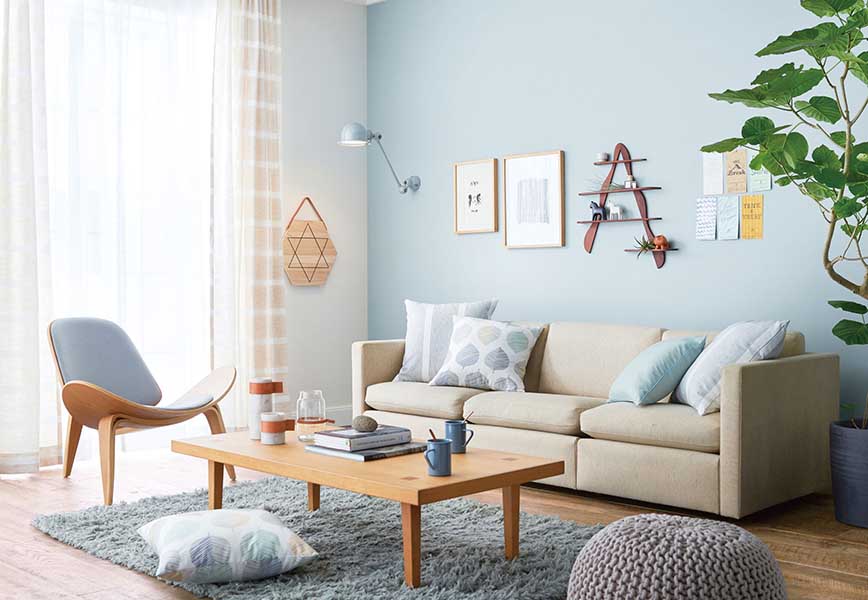 爽やかな塗り壁調のブルーグレーの壁紙は、リビングを明るくフレッシュにしてくれる ブルーはナチュラルな家具やシンプルな家具ともよくマッチし、親しまれる誠実な色だ リビングはみんなで使用する部屋であり、光を感じる明るめの色調もよいだろう FINE FE6132:株式会社サンゲツ日本でも色柄の壁紙を目にする機会が増えてはきたが、実際に選ぶことはまだそう多くない。壁紙選びにはコツがある。まずは色や目的をはっきりさせると選びやすくなる。つい柄に魅せられ部屋に合わない壁紙を選んでしまいがちだが、どんな部屋にしたいのかを考え、色のイメージと貼る壁面を決め、そして決めた壁面のどの範囲に貼るかを考えるといい。