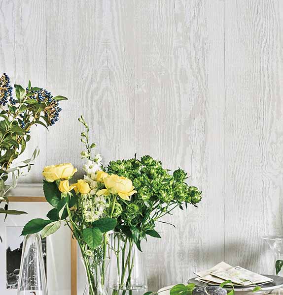 グレーがかった白い木目柄の壁紙は空間を広く感じさせ、こなれたインテリアが作れる。どんなものともコーディネートがしやすく、小物もセンスよく映え、取り入れやすい壁紙である。同じ木目でも生成りになると温かみが増す。節や傷などのダメージ柄をプリントで入れたものは、ラフな手作り感が出る。またダークな木目は重厚な印象となり、落ち着いた雰囲気を出したいときによいだろう。