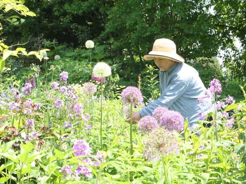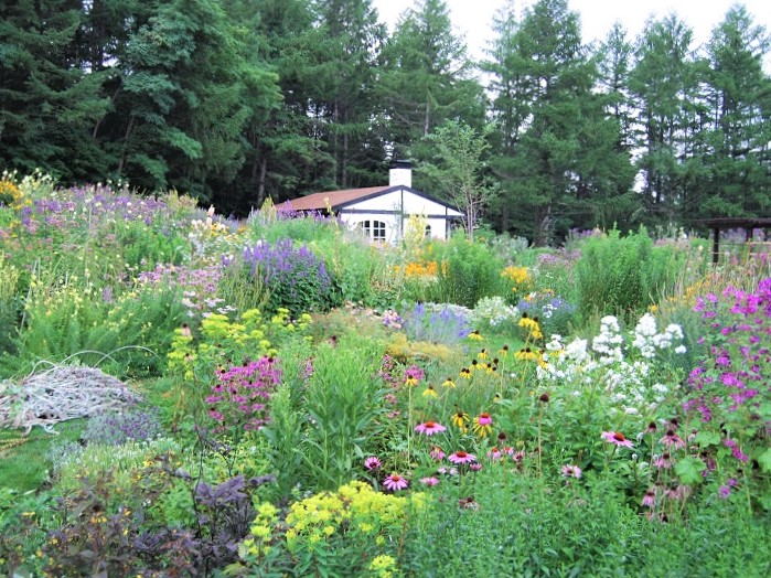 1万3,200m2の敷地に、2,000種以上の草花がある。毎年咲く「宿根草」をほぼ左右対象に植えた「ミラーボーダー」や、悦子さん好みの野草やバラなどを自由に植えた「マザーズガーデン」、小人の気分になれる絵本のような「ノームの庭」など10のゾーンからなる。からっと晴れた空の下、花々は伸びやかだった。