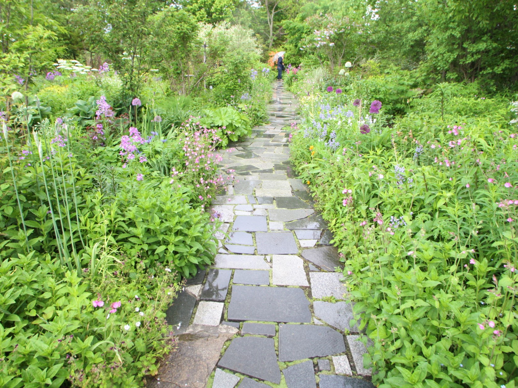 裕幸さんが調達した石を敷いて、通路に。粘土質の土地を改良し、暗渠で水はけを調整。冬にも耐える品種を選び、手探りで庭を作り上げた。そして2001年、「上野ファーム」として1日限りのオープンガーデンを開いた。