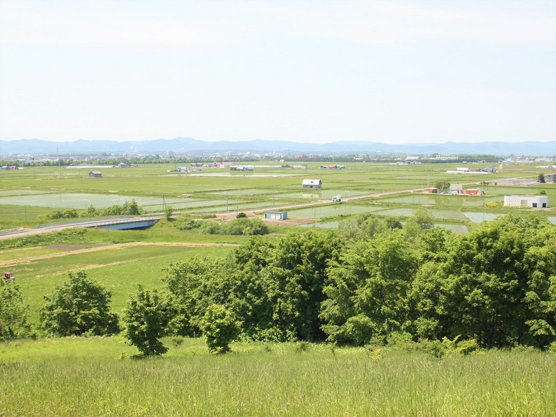 射的山から見えるのは、盆地の旭川らしい田園風景。田んぼに交じって、家屋がポツポツと立つ。上野家は1906年、宮城県からこの地に入植した。