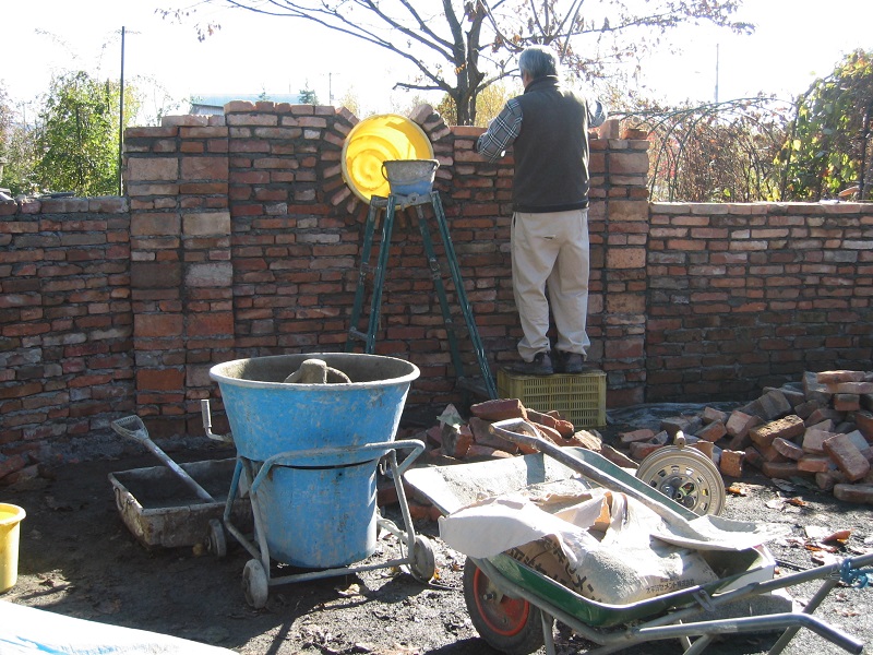 オープン後も少しずつ手を加えた。壊される農協の倉庫からレンガをもらい、セメントをたたいて落とした。レンガ積みの塀は悦子さんがスケッチを描き、漬物の樽で窓枠をくり抜いた。